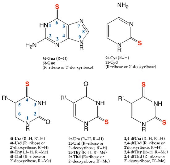 Nucleobase thioderivatives, such as 4t-Urd, 4-thiothyimine (4t-Thy), and 6t-Gua, have also shown a great utility as photolabels to gain detailed knowledge on the structure of nucleic acids, as well as to recognize interaction points within nucleic acids or in nucleic acids protein aggregates, profiting their photocrosslinking properties upon UVA light absorption [17,18,19,20,21,22,23].