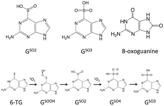 - Zou, X.; Zhao, H.; Yu, Y.; Su, H. Formation of guanine-6-sulfonate from 6-thioguanine and singlet oxygen: A combined theoretical and experimental study. J. Am. Chem. Soc. 2013, 135, 4509–4515. [Google Scholar] [CrossRef] [PubMed]
