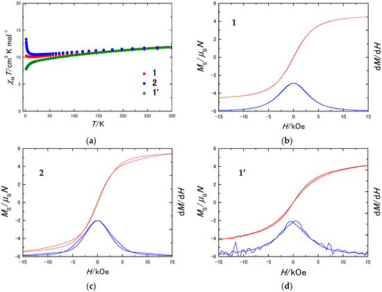 In the magnetization (M) versus field (H) curves for 1, 2, and 1′ at 1.82 K, magnetic hysteresis was observed. The area inside the loop increased in order of 1, 1′, and 2. This result shows that the MD interactions affect the magnetic hysteresis. On the other hand, the magnetic isolation of TbPc2 to minimize the MD interactions also improved the SMM properties, as previously reported for most SMMs [36,55,56,57,58,59]. Therefore, we concluded that the MD interactions in 1 degraded the SMM properties.