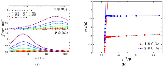 (a) χM” vs. ν plot for 1 and 2 in a zero field. The solid lines were fitted by using the generalized Debye model; (b) Arrhenius plots for 1 and 2. The solid lines were fitted by using the Arrhenius equation. The dashed lines are guides for eyes.
