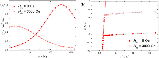In an Hdc of 3000 Oe, the peak in χM” plot for 1 clearly shifted toward the low ν region, as shown in Figure 5a. Arrhenius plot for 1 in Hdc of 3000 Oe (Figure 5b) was fitted by using the Arrhenius equation for high-T region (Ueff = 512 cm−1, τ0 = 5.3 × 10−12 s) and a combination of the Orbach process and QTM for the low-T region (Ueff = 9.61 cm−1, τ0 = 4.2 × 10−2 s, τQTM = 8.83 × 10−2 s) (Figure S12). The Hdc did not affect Ueff for the high-T region. On the other hand, Hdc caused τ to be three orders of magnitude longer than it was in an Hdc of 0 Oe. Since the Hdc induce Zeeman splitting, which causes a difference in the energies of the spin states, the QTM rate between ground states was slower, and τ increased.