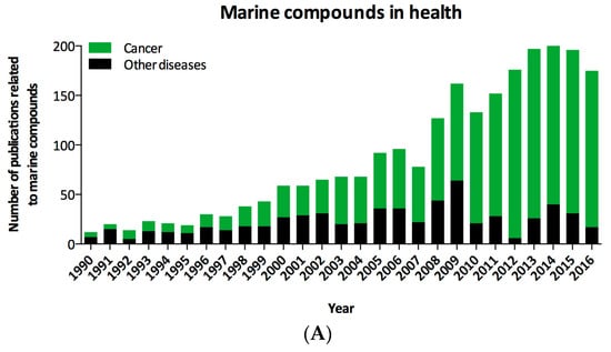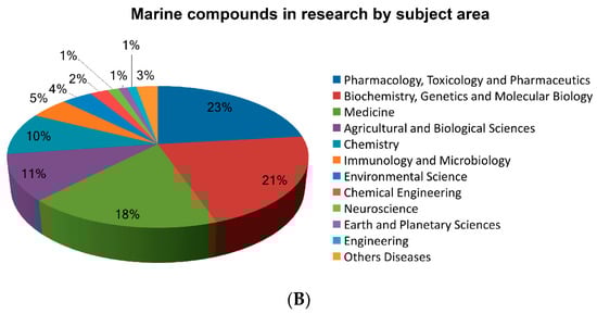 (A) The number of scientific publications about marine compounds displays an upward trend in the last twenty years, especially in the field of cancer; (B) Relevance of marine compounds by subject area. Data have been obtained from PubMed and Scopus for English language publications published without start date restrictions up to January 2017.