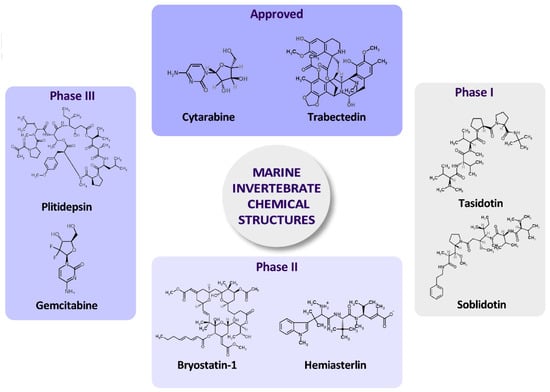 Chemical structures of selected marine invertebrate compounds that are either approved or in clinical trials.