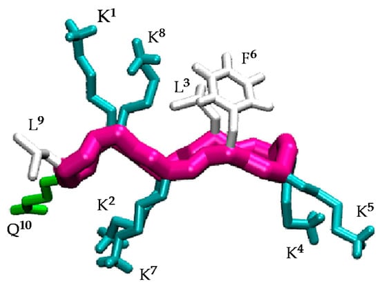 Understanding the structural factors that govern the antimicrobial activity of a library of cyclic peptides is a daunting task. In previous works [30,31,32], a combination of MD simulations and biophysical experiments has highlighted the importance of the specific arrangement of the residues in BPC194 for the formation of stable pores and for inducing the fusion of lipid membranes. In these simulations, a stable β-structure and a symmetric arrangement of the Lys side chains was observed for the peptides inserted in the pore (Figure 1). In particular, the polar side chains of residues K1–K8, K2–K7, and K4–K5 aligned, resulting in a structure reminiscent of an anchor that helped to stabilize the polar head groups of the lipids and the water channel. Based on this, we believe that this structural motif plays a fundamental role in the antimicrobial activity of this peptide and that the precise orientation and alignment of the side chains is essential for its function.