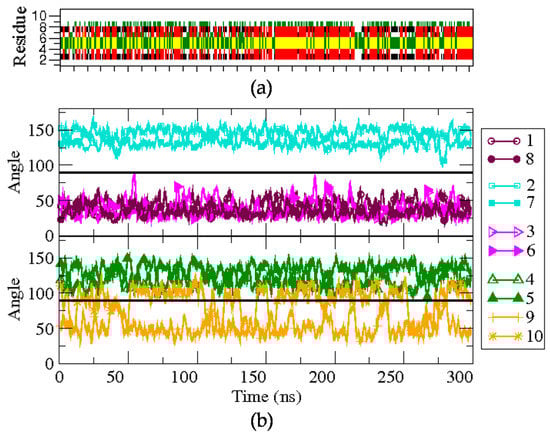 Structural characterization of the BPC194 simulation. (a) The secondary structure as a function of time is calculated by DSSP. The colors denote the β-sheet (red), the turn (yellow), β-bridge (black), bend (green), and random coil elements (white/empty). (b) Time evolution of the angle formed between the normal vector to the backbone plane and a vector representing each of the side chains.