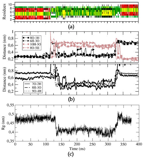 Structural characterization of the BPC198 simulation. (a) DSSP plot, (b) time evolution of the relevant hydrogen bond distances and (c) radius of gyration (nm) of the backbone structure along the trajectory.