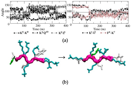 To evaluate how the side chains arrange in space during the unfolding/folding process and whether they align in the upper or in the lower face of the peptide, we analyzed the time evolution of the angles similarly to BPC194. The analysis is displayed in Figure 5. One can observe that the initial structure remained quite constant until around 80 ns. At this point, the side chain of residue Q10 suddenly migrated from the lower face of the peptide to the upper face and temporarily aligned with the K3 side-chain, which remained in the upper face during the whole simulation. A similar process occurred at the same time for the side chain of residue K5. In this case, however, after aligning with the side chain of K8, both started to oscillate around an angle of 90° until the final structure was formed at around 325 ns. These events occurred at a shorter time (80 ns) than the breaking of the intramolecular hydrogen bonds in the backbone (120 ns), suggesting that the latter process was induced by the oscillation of the side chains and not the opposite. In the case of residues K1, L2, F6, and K7, their side chains started to oscillate after 120 ns around a parallel position with respect to the backbone (angle close to 90°). Finally, after 325 ns, just before the formation of the backbone hydrogen bonds that stabilize the final β-structure (340 ns), the side-chain of residue Q10 swung again to the upper face of the peptide and aligned with K3 until the end of the simulation. The residue pair K5–K8 also aligned in the upper face of the conformation, but the angle (around 60°) was larger than that expected for the interaction of two polar residues. The side chains of K1, L2, F6, and K7 ended up in the turn regions of the final β-structure and did not align.