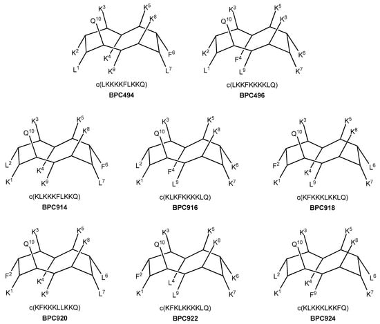 Seven analogues were designed, taking as reference the sequence pattern and active secondary structure of BPC194. The number of hydrophobic and hydrophilic residues, i.e., six Lys, two Leu, one Phe, and one Gln, was maintained, as well as the parallel alignment of the three hydrophilic K–K pairs. Thus, in three analogues (four including BPC194), the hydrophobic residues involved Q–L and L–F pairs (analogues BPC480, BPC482, and BPC484), whereas in the other four analogues, the pairing would take place between the Q–F and L–L residues (analogues BPC486, BPC488, BPC490, and BPC492). The primary structure and the hypothetic conformation of the seven BPC194 analogues are depicted in Figure 6. Peptides differed in terms of the relative distribution of the hydrophilic K–K and hydrophobic pairs on the upper and lower regions of the hypothetic active structure.