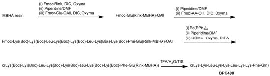 The synthesis of the cyclic decapeptides was carried out on a 4-methylbenzhydrylamine (MBHA) resin (0.4 mmols/g) following a 9-fluorenylmethoxycarbonyl (Fmoc)/tert-butyl (t-Bu)/Allyl strategy by carrying out the solid-phase synthesis of the linear sequence followed by on-resin cyclization (Scheme 1). The tert-butyloxycarbonyl (Boc) group was used as side-chain protection for Lys. Fmoc-Glu-OAll was attached to the solid support through the side chain to serve as a peptide anchoring point to the support, and resulted in a Gln after peptide cleavage from the resin. After the coupling of the Fmoc-Rink linker, the linear peptidyl resin was constructed by sequential Fmoc deprotection and coupling steps. Fmoc group removal was performed with piperidine/DMF (3:7) and amino acid couplings were mediated by N,N-diisopropylcarbodiimide (DIC) and ethyl 2-cyano-2-(hydroxyimino)acetate (Oxyma). Once the synthesis of the linear peptidyl resin was completed, the C-terminal allyl ester cleavage was achieved by treatment with Pd(PPh3)4 in CHCl3-AcOH-N-methylmorpholine (NMM) (37:2:1) and it was followed by Nα-Fmoc group removal. Cyclization was then performed using 1-[(1-(cyano-2-ethoxy-2-oxoethylideneaminooxy)-dimethylamino-morpholinomethylene)] methanaminium hexafluorophosphate (COMU), Oxyma, and N,N-diisopropylethylamine (DIEA). Finally, the resulting cyclic decapeptides were acidolytically cleaved, analyzed by high-performance liquid chromatography (HPLC), and characterized by mass spectrometry. They were obtained in HPLC purities ranging from 94 to >99%.