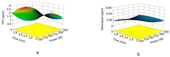 Figure 3a,b indicate the effect of extraction time on TPC and oleuropein extraction. As can be seen in the figure, it was observed that extraction time had a negative influence on the SFMAE of TPC and oleuropein. This result might be explained by the fact that long extraction times promote oleuropein degradation, mainly due to overheating during long extraction times. TPC had a slight rise after a while, since heat sensitive materials might promote the degradation of other compounds; therefore, those components coming from degraded polyphenols could contribute to the formation of other polyphenols in the extract. Similarly, Ballard et al. [32] also observed a non-significant TPC trend, with a decrease in TPC extraction from peanut skins when irradiation time was augmented at 90% power. These results suggest that applying high MW powers for short times may be the most effective way to extract TPC from olive leaves.
