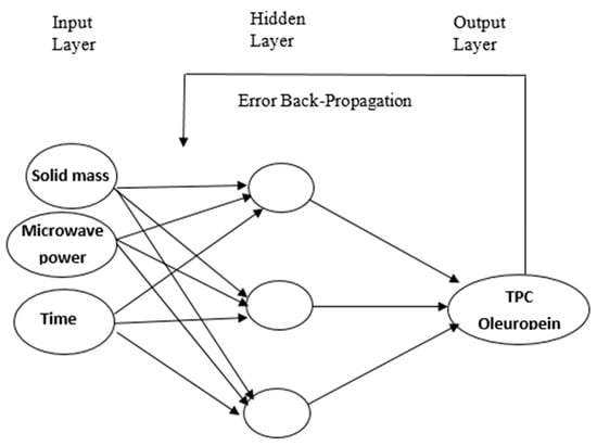 A three-layered feed-forward back-propagation neural network with a linear transfer function was developed for modelling TPC and oleuropein extraction from olive leaves. ANN consisted of three layers: (i) an input layer (independent variables: sample (g), MW power (W), and extraction time (min)), (ii) an output layer (dependent variables: TPC and oleuropein), and (iii) one or more intermediate nodes (a collection of feature detectors) [43]. Taking into account the selected independent and dependent variables, a network with three neurons in the input layer and one in the output layer was the selected model. Then, the best neural network model was generated following a number of training trials.
