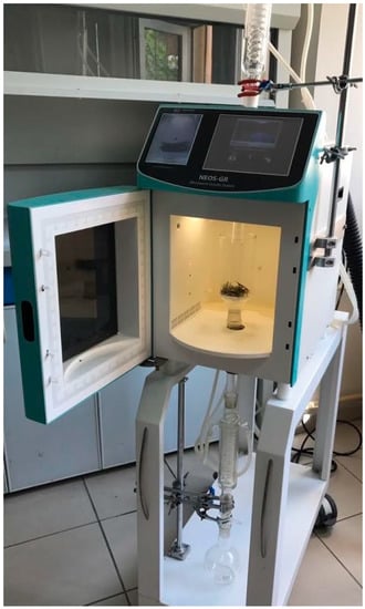 As seen in Figure 5, the equipment for SFMAE consists of MW apparatus (NEOS-GR, Milestone Srl, Italy) operating at 2.45 GHz (900 W maximum power). The extractor had specific software and a video camera. Water was used as pre-treatment to enhance the extraction process. Olive leaves (5, 7.5, and 10 g) were placed in a 1 L Pyrex® glass beaker and placed in the MW oven at 250, 300, and 350 W for a certain period of time (2, 2.5, and 3 min). The extraction was performed at atmospheric pressure. The extract was drained by gravity on a condenser outside the MW irradiation cavity and was cooled down at room temperature [36]. Then, the mixture was centrifuged (Nuve, CN 180) at 5000× g for 25 min. Subsequently, the supernatant was filtered through a 0.45 μm syringe filter and stored at −80 °C until needed for analysis.