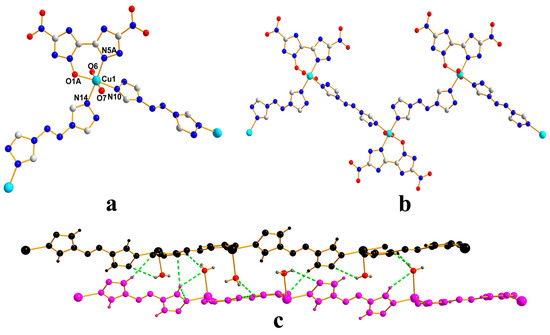 Complex 2 crystallizes in the monoclinic space group P21/n (see Table S1) with a 1D porous MOF, in which there is one crystallographically-independent copper atom. The molecular structure is shown in Figure 2a. The asymmetry unit is composed of a copper ion as the center of the equatorial plane, and it includes one Cu(II) ion, one DNBTO ligand, two ATRZ ligands, and two H2O molecules (Figure 2). DNBTO adopts a bidentate bridging mode to coordinate the copper atom. The Cu(II) ion is hexa-coordinated to three nitrogen atoms from DNBTO and ATRZ ligands (N5, N10, and N14) and three oxygen atoms (O1, O6, and O7) from DNBTO and water molecules [Cu1–N5A = 1.954(9), Cu1–N10 = 2.004(4), Cu1–N14 = 2.016(0), Cu1–O1A = 1.965(6), Cu1–O6 = 2.326(5), and Cu1–O7 = 2.380(3) Å], and the N–Cu–N bond angles are in the range 81.95–174.03° (Table S3) in a distorted octahedron-like structure. ATRZ bridges the skeleton. The intermolecular hydrogen bonds between hydroxy and nitro groups are shown by dashed lines in Figure 2c. The hydrogen bonds and π-π interactions result in molecular stacking planes with an interplanar distance of 6.02 Å. Abundant hydrogen bonds, including O6–H6···N10, C5–H5···N11, C8–H8···O7, and C8–H8···O1A with distances range from 1.913 to 2.416 Å (see Table S4), between expanded chains result in a stable 1D structure.