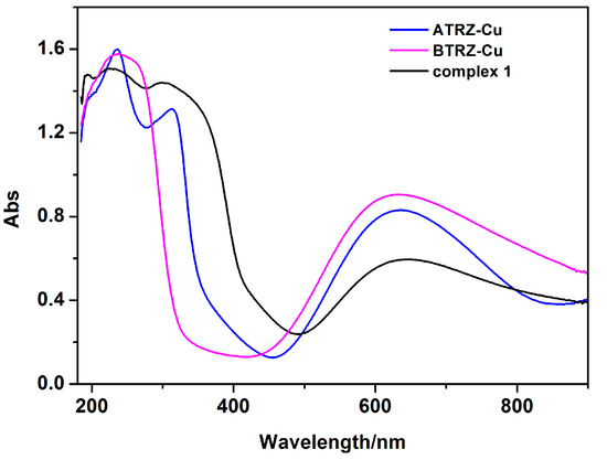 Ultraviolet absorption spectra of complex 1, ATRZ-Cu and BTRZ-Cu.