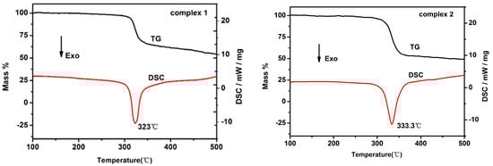 The thermal decomposition temperatures of the complexes were determined by thermogravimetric/differential scanning calorimetry (TG/DSC) with a linear heating rate of 10 °C min−1 under nitrogen atmosphere, and their TG/DSC curves are shown in Figure 4. According to the TG curve of complex 1, it undergoes a main weight loss (40.4%) in the temperature range 300–350 °C, which is attributed to the decomposition of the coordination framework. Meanwhile, the DSC curve further showed that these is only one intense exothermic peak with a peak temperature of 323.0 °C, which corresponds to its decomposition temperature. In addition, complex 2 also undergoes significant weight loss (49.8%) in the temperature range 290–370 °C, which is attributed to the decomposition of the coordination framework. There is only one exothermic process with a peak temperature of 333.3 °C in its DSC curve (Figure 4). These complexes are among very few energetic materials that show thermal stability above 300 °C [29,30,31]. Furthermore, complex 1 is more thermally stable than nearly all energetic salts and cocrystals of DNBT reported at present [11,32]. The decomposition temperature of complex 2 (333.3 °C) is also the highest among those of all reported high-energy MOFs with 1D chain structures [33]. The high thermal stabilities of these complexes are presumably caused by strong multiple intermolecular interactions such as hydrogen-bonding and π-π stacking.