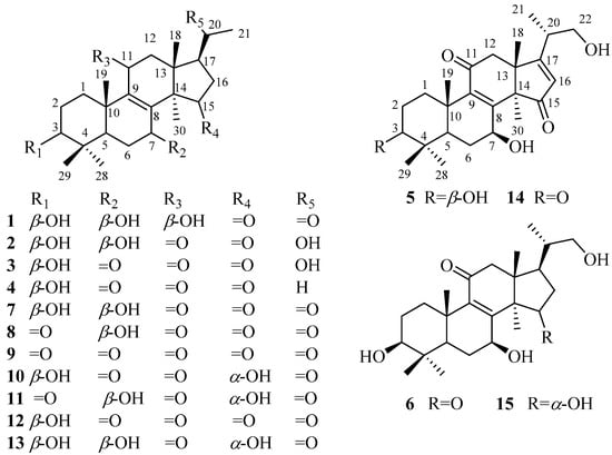 As a member of the genus Ganoderma, G. resinaceum has been used for immune-regulation, hyperglycemia, and liver disease [11]. The extract of G. resinaceum exhibited antimicrobial, antioxidant, and inhibitory activities against acetyl cholinesterase, tyrosinase, α-amylase and α-glucosidase [12]. At present, only 17 triterpenoids had been obtained from the fruiting bodies of G. resinaceum, whose biological properties included cytotoxicity [13] and hepatoprotective activities [9]. Obviously, the chemical constituents isolated from G. resinaceum and their biological activities have not been thoroughly characterized yet. Aiming to elucidate bioactive constituents from G. resinaceum, our team carried out phytochemical investigation on G. resinaceum. In this study, six new compounds (1–6) and nine known compounds (7–15) (Figure 1) were obtained from the fruiting bodies of G. resinaceum. The structures of the new compounds were elucidated by extensive spectroscopic data (HRMS, NMR, IR, and UV). The known compounds were identified by comparison of MS and 1 D NMR spectroscopic data with those reported in the literature. Compounds 3, 4, and 7–15 were evaluated for inhibitory activity against α-glucosidase and display no significant activity, however this finding may support that the side chain of ganoderma triterpenoids is critical for α-glucosidase inhibitory activity.