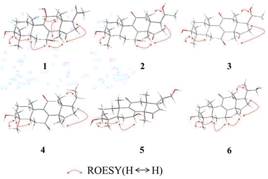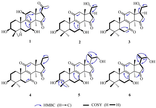 The key HMBC, and 1H–1H COSY correlations of 1–6.