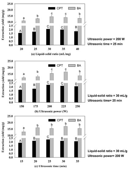 The ultrasonic extraction time is an important function during solvent extraction [28]. The influence of time on the yield of the two compounds was assessed over a range of 15–35 min using 200 W of ultrasonic power under the same liquid–solid ratio conditions. Figure 2c shows that the extraction yields of CPT and BA clearly increased for times up to 20 min, then did not change significantly. This phenomenon may be explained by the ultrasonic waves induced at the beginning of ultrasonic processing causing chaotic vibrations at the solvent–solid interface. These vibrations could then disrupt the cells and speed up the release and diffusion of the target compounds, thus improving the extraction yields of the target compounds markedly to reach a maximum value. For longer ultrasonic time, the target components would no longer be released, so extraction yields would not have changed significantly. Therefore, 20 min was selected as the ultrasonic time for the further experiments.