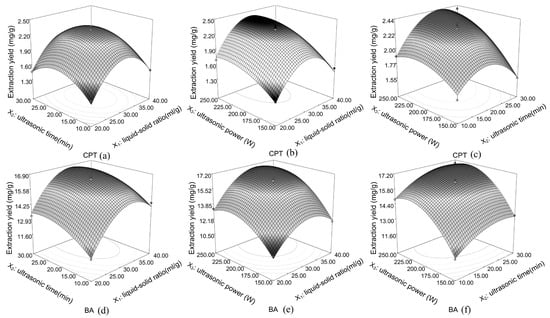 Response surface plots showing the effects of variables (X1: liquid–solid ratio, mL/g; X2: ultrasonic time, min; and X3: ultrasonic power, W) on the extraction yields of CPT (a–c) and BA (d–f).