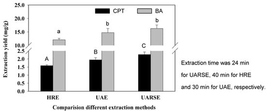 The UARSE, HRE and UAE methods were compared (Figure 4). This indicated that UARSE provided the highest extract yields of CPT and BA (2.386 ± 0.112 mg/g and 17.192 ± 0.808 mg/g, respectively). The yields of CPT and BA provided by UAE (2.036 ± 0.094 mg/g CPT and 15.804 ± 0.727 mg/g, respectively) and HRE (1.624 ± 0.070 mg/g and 12.457 ± 0.536 mg/g, respectively) were lower. In addition, the extraction time using UARSE required for the equilibrium yields of CPT and BA was only 24 min, which was 80% and 60% less than those for HRE and UAE, respectively.