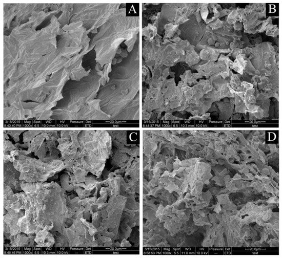 Scanning electron microscopic images of C. acuminata Decne. fruit samples. (A): Raw materials; (B–D) Show samples treated by HRE, UAE, and UARSE, respectively.