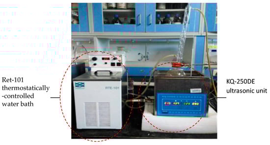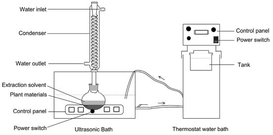 The ultrasonic assisted-reflux synergistic extraction (UARSE) device was made up of an ultrasonic unit and a thermostatic water bath (Figure 6 and Figure 7). The KQ-250DE ultrasonic unit used in the present study, with a maximum power of 250 W, was manufactured by Kunshan Ultrasonic Instruments Co. Ltd. (Kunshan, China). The unit was a cube-shaped container (23.5 × 13.3 × 10.2 cm), containing a 40 kHz ultrasonic transducer placed at the bottom. A circulating water-cooling system condensed the distillate continuously. A Ret-101 thermostatically-controlled water bath with a temperature controller (Neslab Instruments Inc., Newington, NH, USA) was connected to the ultrasonic unit to maintain the boiling state of the extracting solvent. The energy from the assembled UARSE device could thus be constantly transmitted into the reaction vessel.