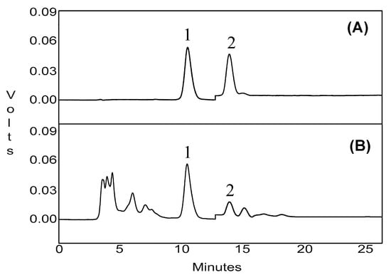 The target compounds were quantified using an HPLC system consisting of a PU-980 pump, and an UV-975 detector (Jasco International Co. Ltd., Tokyo, Japan). Chromatographic separation was achieved on a Kromasil-C18 reversed-phase column (4.6 mm × 250 mm, 5 μm, KYA Technologies Corporation, Tokyo, Japan). The conditions for HPLC analysis were as follows: the mobile phase consisted of methanol: water (90:10, v/v), which was filtered through a 0.45 μm membrane filter, then deaerated ultrasonically before use; the flow rate was maintained at 0.8 mL/min; the injection volume was 20 μL; and the column temperature was 25 °C. The UV detection wavelength was set at 254 nm (0–13 min) then at 215 nm (13–25 min). The HPLC chromatograms of the standards and samples produced under these conditions are shown in Figure 8.