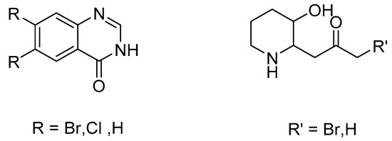 Febrifugine and isofebrifugine (Figure 1), were first isolated from leaves of Dichroa Febrifuga Lour in 1948, and two years later, their skeletal structures were reported [1]. After more than 40 years of research, determination of the absolute configuration of the two natural products was achieved (febrifugine: 2R,3S; isofebrifugine: 2S,3S) [2]. In 1967, a derivative of febrifugine named halofuginone hydrobromide (1) was first synthesized by American Cyanamid Company, which later transferred this product to Roussel Uclaf S. A. who marketed it in a premix named “Stenorol” [3]. Halofuginone hydrobromide has been proved to possess broad pharmacological functions, such as anti-coccidial [4,5,6], anti-fibrosis [7,8,9], anti-tumor [10,11,12] and growth-promoting activities [13]. In clinic application, addition at a dose of 3 mg·kg−1 in animal feed exhibit great effects against almost all types of coccidia [14,15,16].