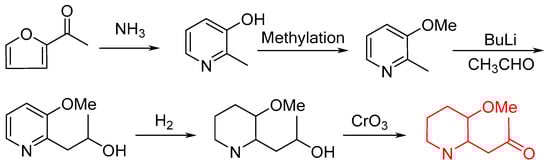 Synthesis of 2-acetonyl-3-methoxyl piperidine involving the application of pyridine derivatives.