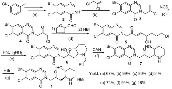 Our synthetic route to halofuginone hydrobromide is described in Scheme 6. Firstly, compound 2 was prepared from 3-chlorotoluene by the optimized method of Route B (Scheme 2) under improved conditions, which proved our most difficult and challenging task.
