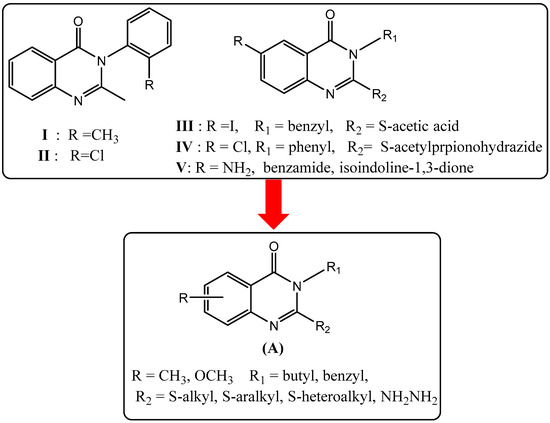 Based on the aforementioned considerations, bearing in mind the inherited anticonvulsant potency of quinazoline nuclei together with the similarities between methaqualone, mecloqualone, the reported anticonvulsants and our synthesized derivatives (A) (Figure 1), we report the evaluation of a new synthesized quinazolines series (1–24) [23,24,25] for anticonvulsant effects to explore the influence of butyl and benzyl groups at position 3 of the quinazolines (4–16,22,24) and (16–21,23), respectively. In addition, this study aims to investigate the electronic effect of the electron donating- and withdrawing groups at position 2- on the anticonvulsant activity and hence deduce the structure activity relationship (SAR).