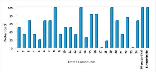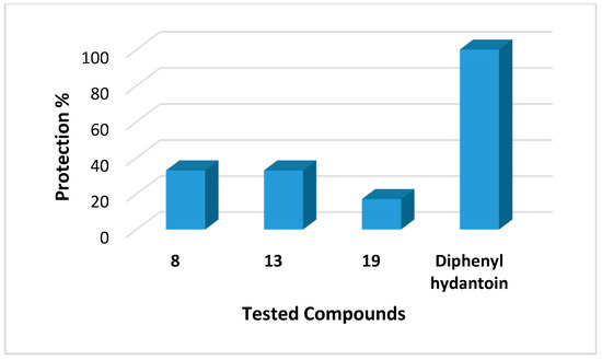 Furthermore, compounds 8, 13 and 19 subjected to MES-induced seizure and produced 17, 33 and 33% protection against MES-induced seizure (Figure 3), respectively. These findings suggest that 8, 13 and 19 possess the ability to prevent the spread of seizure discharge and to raise seizure threshold. In the current investigation, all candidates 1–24 were devoid of neurotoxicologically effects (motor dysfunction), which has detected by using the rotarod screen [31].