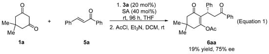 Fortunately, we finally found that the Michael addition of chalcone worked properly in the presence of squaramide 7 derived from quinine (see supporting material) [54,55]. As outlined in Table 3, this Michael addition was independent of the electronic nature of the substituents on the aromatic rings. Both the electron-rich acceptors 5b and 5f and the electron-deficient acceptors 5c and 5g generated the expected adducts in satisfactory yields and excellent optical purities (Table 3, entries 2 and 6 vs. entries 3 and 7). Moreover, the steric hindrance exerted influence on this Michael addition to a certain extent. The enone 5e possessing a naphthyl group afforded relatively lower isolated yield (68%) even after a prolonged reaction time, albeit accompanied by outstanding enantioselectivity (entry 5). Heteroaromatic chalcones 5d and 5h were also favorable partners, giving rise to the final acetyl derivatives with high levels of enantiopurities (entries 4 and 8). Except for dimedone, 1,3-cyclohexanedione 1b was a competent donor as well, albeit a longer reaction time was required in order to achieve complete conversion (entry 9). In contrast with Singh’s precedent study (72% ee for 6aa) [38], our protocol efficiently improved the enantioselectivity and displayed a wide substrate generality for this Michael addition of cyclic β-dione to chalcone [56]. Moreover, a one mmole-scale Michael addition of chalcone 5a with dimedone 1a proceeded smoothly as well. The expected acetyl derivate 6aa was formed in an almost quantitative yield and with satisfactory enantioselectivity (entry 1). The alkyl-substituted enone 5i was also a suitable acceptor, albeit unsatisfactory enantioselectivity was obtained for the resulting Michael adduct (entry 10).