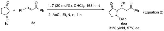 The five-membered cyclic dione, 1,3-cyclopentadione 1c, was also tolerated by our catalytic protocol (Scheme 2). However, it proved to be an inferior donor in terms of reactivity and enantioselectivity, in contrast with the six-membered cyclic dione. The related acetyl derivative 6ca was obtained in an unsatisfactory yield and with moderate optical purity.