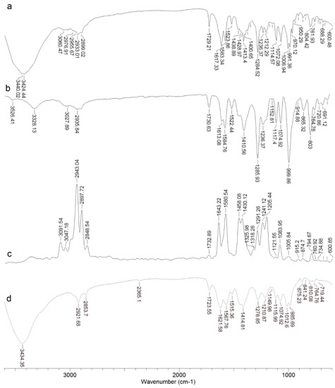 IR KBr (a) and ATR (b) and Raman (c) spectra of DOX (continuous lines) and IR KBr spectra of Cu-DOX complex (the dotted line) (d).