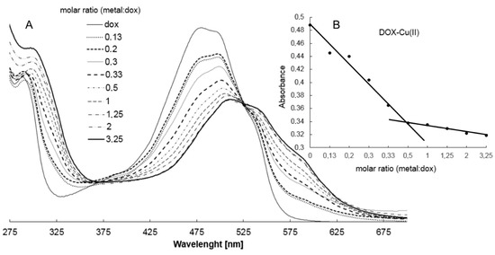 (A) Absorption spectra of DOX in the presence of various amounts of Cu(II) in Tris-HCl buffer pH 7.01 (different types of lines are labeled with a molar ratio Cu(II):DOX 0.13–2.0); (B) absorbance as a function of [Cu(II)]:[DOX] molar ratio at 500 nm.