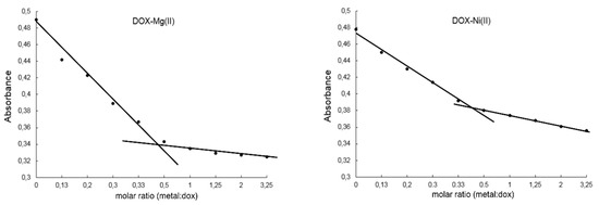 After each addition, the solution was stirred in the cuvette and the absorbance of the solution was measured. DOX was complexed with iron, copper, cobalt, manganese, nickel, magnesium and zinc at pH 7.01. For complexes with fixed composition in solution, the measurement was repeated after 24 h to determine the stability of the complexes. UV-VIS spectra were recorded in the range of 190–800 nm with a HACH 2000 spectrometer (HACH Company, Loveland, CO, USA).