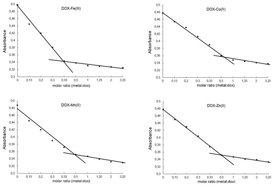 Absorbance as a function of [Metal]:[DOX] molar ratio at 500 nm. Metal-Dox complexes are water-soluble and they were prepared in Tris-HCl buffer pH 7.01.