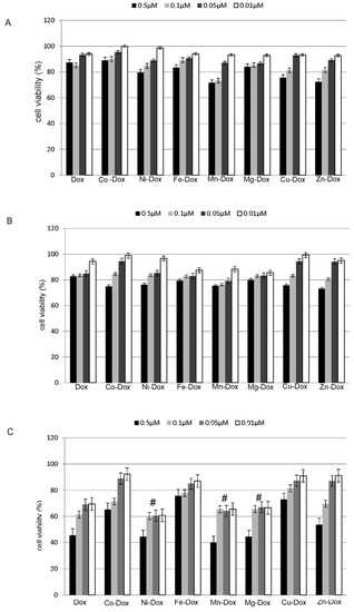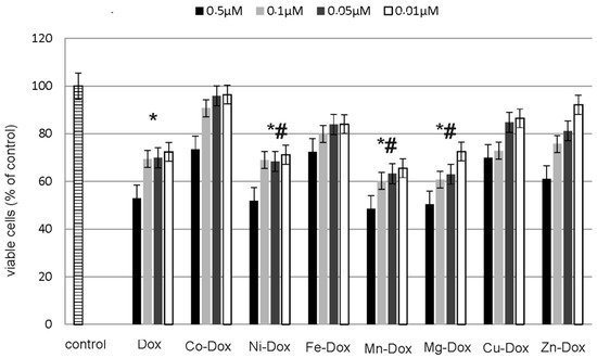 DOX, Cu-DOX, Zn-DOX, Co-DOX, Ni-DOX, Fe-DOX, Mn-DOX and Mg-DOX cytotoxicity in MCF-7 cells. The cells were incubated with 0.5 µM, 0.1 µM, 0.05 µM and 0.01 µM DOX and Metal-DOX complexes for 24 h. Mean values from five independent experiments ± SD are shown. Significant alterations are expressed relative to control untreated cells (marked with asterisks *) and to DOX—controls (marked with crosses #). Statistical significance was considered if #* p < 0.05.
