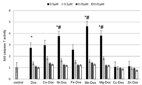 The effect of DOX, Cu-DOX, Zn-DOX, Co-DOX, Ni-DOX, Fe-DOX, Mn-DOX and Mg-DOX on apoptosis in MCF-7 cells. The cells were incubated with 0.5 µM, 0.1 µM, 0.05 µM and 0.01 µM DOX and Metal-DOX complexes for 24 h. Mean values from five independent experiments ± SD are shown. Significant alterations are expressed relative to control untreated cells (marked with asterisks *) and to DOX—controls (marked with crosses #). Statistical significance was considered if *# p < 0.05.