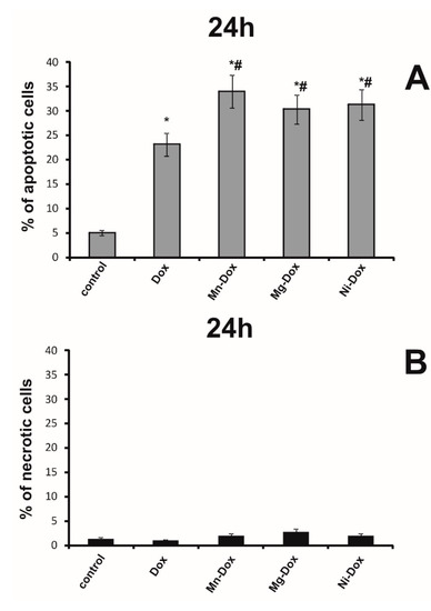 The effect of DOX, Ni-DOX, Mn-DOX and Mg-Dox on apoptosis of MCF-7 cells. The cells were incubated with 0.5 μM DOX, Ni-DOX, Mn-DOX and Mg-DOX for 24 h. Bar graphs presenting the percentage of apoptotic MCF-7 (A) and necrotic MCF-7 (B) cells, are demonstrated. Mean values from five independent experiments ± SD are shown. Significant alterations are expressed relative to control and marked with asterisks (*); significant alterations are expressed relative to DOX-control and marked with crosses (#). Statistical significance was considered if *# p < 0.05.