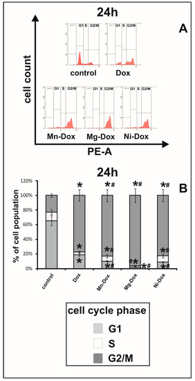 To investigate the connection between anti-proliferative activity of DOX and Ni-DOX, Mn-DOX and Mg-DOX (0.5 µM, 24 h) and cell-cycle arrest, flow cytometry was used. Twenty four hour treatment with DOX-metal complexes: Mg-DOX, Mn-DOX and Ni-DOX in 0.5 µM concentration, affected the cell cycle in studied cell line (Figure 12). A significant increase in the number of cells in G2/M phase with a simultaneous decrease in S and G1 phase was observed in all of the tested compounds as compared to DOX. The results were also referred to the control, non-treated cells. Analysis of flow cytometry results revealed also that MCF-7 cells cultured with DOX and its metal complexes showed significant differences in the distribution of cell cycle phases, with more pronounced effects observed in case of Mg-DOX than the other tested compounds.