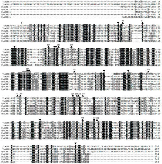 Figure 1. Amino acid sequence alignment of acetylcholinesterase (AChEs) from P. pseudoannulata and other species. Identical amino acids are shaded in black for 100% identity and grey for 80% similarity. The ‘▲’ represents the 14 aromatic residues, ‘▼’ indicates the six cysteine residues, ‘■’ shows the catalytic triads, and ‘●’ indicates the oxyanion hole. The conserved sequence ‘FGESAG’ is underlined. The numbering on the amino acid sequences indicates the positions for Torpedo californica AChE amino acids, which starts at the N-terminus of the mature protein. Tc: Torpedo californica (CAA27169); Tu: Tetranychus urticae (AAO73450); Pp: Pardosa pseudoannulata (KF543247, KU501286, KU501287, KU501288, KU501289).