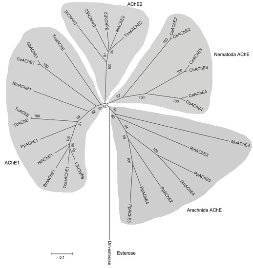 11. Combes, D.; Fedon, Y.; Grauso, M.; Toutant, J.P.; Arpagaus, M. Four genes encode acetylcholinesterases in the nematodes Caenorhabditis elegans and Caenorhabditis briggsae. cDNA sequences, genomic structures, mutations and in vivo expression. J. Mol. Biol. 2000, 300, 727–742. [Google Scholar] [CrossRef] [PubMed]
