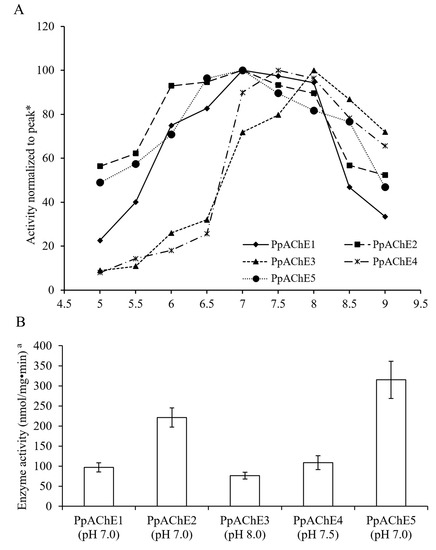 Figure 3. Optimal pH conditions for PpAChE5. (A): Enzyme activities under different pH conditions. (B): Enzyme activities of five AChEs under their optimal pH conditions. Data are the mean ± SEM of at least five independent experiments. For clarity, only one representative curve for each enzyme is shown. Data of PpAChE1-4 were from our previous study [12].