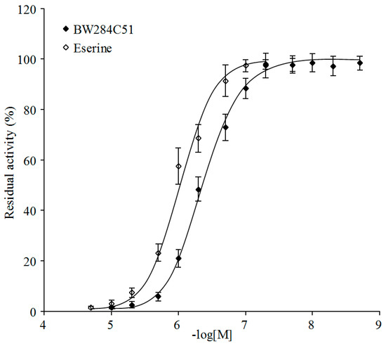 Figure 4. Inhibition curves of two inhibitors against ATC hydrolysis activity of PpAChE5. The data are the mean ± SEM of at least five independent experiments.