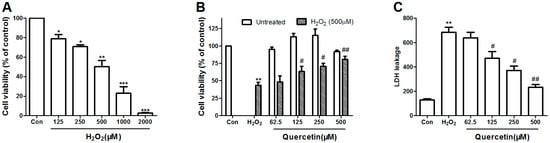 Protective effect of quercetin on H2O2-induced cytotoxicity in PC12 cells. (A) PC12 cells were treated with the indicated concentrations (125–2000 μM) of H2O2 for 24 h; (B) The cytotoxic of quercetin was examined after incubation with the indicated concentrations of quercetin for 24 h treatment using MTT assay. In the protected group, PC12 cells were pretreated with different concentrations of quercetin for 2 h, and then rinsed thrice with phosphate-buffered saline (PBS). Subsequently, the pretreated cells then were incubated with or without 500 μM H2O2 for an additional 24 h, and viability of cells was assessed by MTT assay. Percentage of cell viability was relative to the untreated control cells; (C) PC12 cells were pretreated with different concentrations of quercetin for 2 h, and then rinsed thrice with PBS. Subsequently, the pretreated cells then were incubated with or without 500 μM H2O2, after 24 h the supernatant was obtained for the measurements of LDH using commercial kits. Values represent mean ± SEM. of three independent experiments. * p < 0.05, ** p < 0.01, *** p < 0.001 versus control; # p < 0.05, ## p < 0.01 versus H2O2 treated cells. LDH, lactate dehydrogenase; H2O2, hydrogen peroxide. Con, untreated.