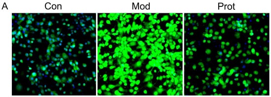 Intracellular ROS levels were examined using a non-fluorescent agent DCFH-DA. DCFH-DA is a non-fluorescent lipophilic ester that easily penetrates the plasma membrane and passes into the cytosol, where this molecule was activated by esterase-mediated cleavage of acetate to form DCFH. DCFH was oxidized to the formation of DCF in the presence of ROS, results in a green fluorescence. The fluorescence intensity is generally considered to reflect the level of intracellular ROS []. In brief, PC-12 cells (5 × l03 cells/well) were seeded in 96-well plates for 24 h incubation. After the indicated treatment, cells were washed with PBS buffer and were incubated with DCFH-DA in complete medium at 37 °C for 30 min. After incubation, cells were washed with PBS and the intracellular ROS was also detected by observing DCF using high-content screening (HCS, Thermo Fisher Scientific, Waltham, MA, USA) at an excitation wavelength of 485 nm and an emission wavelength of 525 nm, respectively. Control groups consisted of cells incubated with medium only.