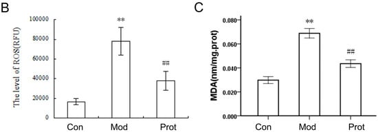 Quercetin inhibits H2O2-induced ROS and MDA production in PC-12 cells. (A) Cells were pretreated with quercetin (500 μM) for 2 h, and then rinsed thrice with PBS. Subsequently, the pretreated cells then were incubated with 500 μM H2O2 for another 24 h. Intracellular ROS levels were indicated by DCF fluorescence intensity and detected by high content screening; (B) the fluorescence intensity of group A were calculated, and the results were expressed as areas under the curve of relative light units (RLU); (C) cells were pretreated with quercetin (500 μM) for 2 h, and then rinsed thrice with PBS. Subsequently, the pretreated cells then were incubated with 500 μM H2O2 for another 24 h. The intracellular MDA levels were measured. Values represent means ± SEM, n = 3. ** p < 0.01 vs. control; ## p < 0.01, vs. model. MDA, malondialdehyde; Con, untreated; Mod, H2O2 treated; Prot, quercetin + H2O2 treated.