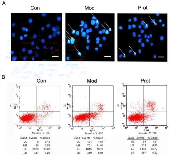 We assessed apoptosis using Hoechst 33342 and fluorescence activated cell sorting (FACS) analysis. In Hoechst 33342 staining, PC-12 cells were seeded into six-well plates, after various treatment cells were stained with 1 μg/mL Hoechst 33342 for 5 min. The cells were washed and fixed with 4% paraformaldehyde in PBS for 5 min at 4 °C, then observed by fluorescence microscopy. Cells with condensed nuclei were considered apoptotic, and the percentage of apoptotic cells in PC-12 was determined by examining at least 300 cells per group, at ×400 magnification. The apoptosis assays were also conducted using an Annexin-V-FITC apoptosis detection kit by flow cytometry, according to the manufacturer’s instructions. PC-12 cells were exposed to various conditions treatment, and were harvested and washed twice with cold PBS, resuspended in 1× binding buffer. After incubation with Annexin V for 15 min in the dark at RT, the cells were immediately analyzed by flow cytometry.